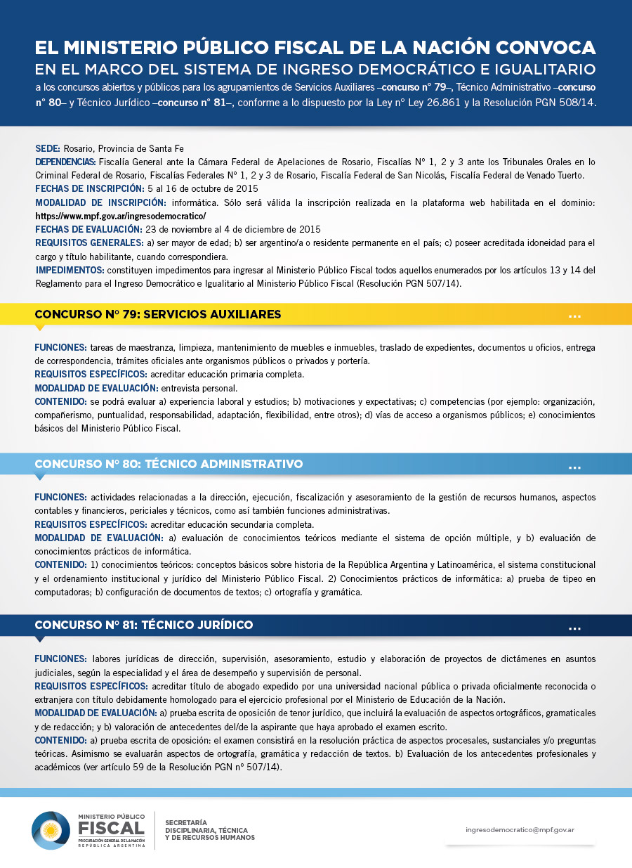 Mediante la resolución ING 3000/2015, la Procuración General de la Nación, en el marco del Sistema de Ingreso Democrático e Igualitario, convoca a los concursos abiertos y públicos n° 79: Servicios Auxiliares; 80: Técnico Administrativo, y 81: Técnico Jurídico, para cubrir las vacantes que se generen en la Fiscalía General ante la Cámara Federal de Apelaciones, la Fiscalía N° 1 ante los Tribunales Orales en lo Criminal Federal, la Fiscalía N° 2 ante los Tribunales Orales en lo Criminal Federal, en la Fiscalía N° 3 ante los Tribunales Orales en lo Criminal Federal, la Fiscalía Federal N° 1, la Fiscalía Federal N° 2, la Fiscalía Federal N° 3, todas de Rosario, y en la Fiscalía Federal de San Nicolás y la Fiscalía Federal de Venado Tuerto.