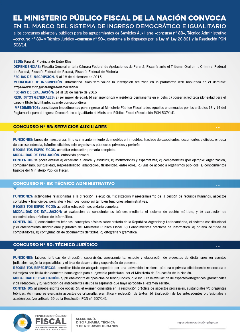 Por un lado, se desarrollarán los concursos N°88 (Servicios Auxiliares), N°89 (Técnico Administrativo) y N°90 (Técnico Jurídico) para sustanciar los cargos que surjan en la Fiscalía General ante la Cámara Federal de Apelaciones, la Fiscalía ante el Tribunal Oral en lo Criminal Federal y la Fiscalía Federal, todas con sede en Paraná, en la y Fiscalía Federal de Victoria. El período de inscripción se extenderá desde el 9 al 18 de diciembre, ambos días inclusive, y debe realizarse a través de la página web https://www.mpf.gov.ar/ingresodemocratico/. Por su parte, la evaluación de los postulantes tendrá lugar entre el 14 y el 18 de marzo del año próximo.