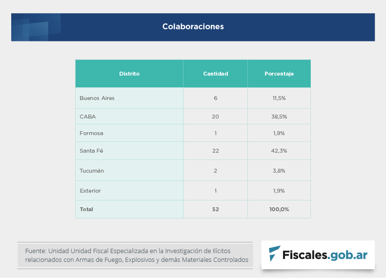 En relación a las jurisdicciones desde donde se solicitaron esas colaboraciones, en este segundo cuatrimestre, la provincia de Santa Fe abarcó el 42,3% de los pedidos (22), seguida de cerca por la Ciudad Autónoma de Buenos Aires (20) con el 38,5%. Otros distritos donde UFIARM colaboró en menor medida fueron la provincia de Buenos Aires (6) con el 11,5%; Tucumán (2) con el 3,8%; mientras que Formosa y autoridades judiciales del exterior, con un caso cada uno, tienen cada uno el 1,9%.