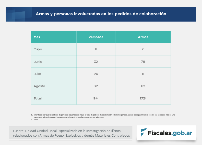 El estudio también reporta que, en los 52 pedidos de colaboraciones de este segundo período analizado, estaban involucradas 94 personas y 172 armas.
