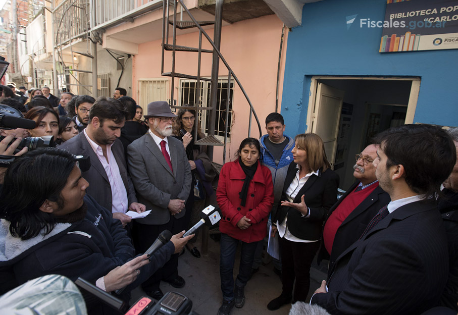La procuradora general de la Nación, Alejandra Gils Carbó, encabezó esta tarde el acto de inauguración de la Biblioteca Popular de Derechos “Carlos Mugica”, ubicada en la casa 38 de la manzana 105 de la villa 31, en la Ciudad Autónoma de Buenos Aires. “Esta creación es parte de una política que entiende que el delito no se combate sólo con allanamientos”, señaló la titular del Ministerio Público Fiscal. El espacio de estudio y formación fue recuperado para uso social, en el marco de la articulación judicial con el Juzgado Federal N°4, a cargo de Ariel Lijo, y la Fiscalía Criminal y Correccional Federal N°1, encabezada por el fiscal federal Jorge Di Lello, tras las derivaciones de una causa penal por el delito de comercialización de estupefacientes en la Villa 31, en la que ayer el propio Di Lello solicitó la elevación a juicio oral, tras cuatro meses de investigación.