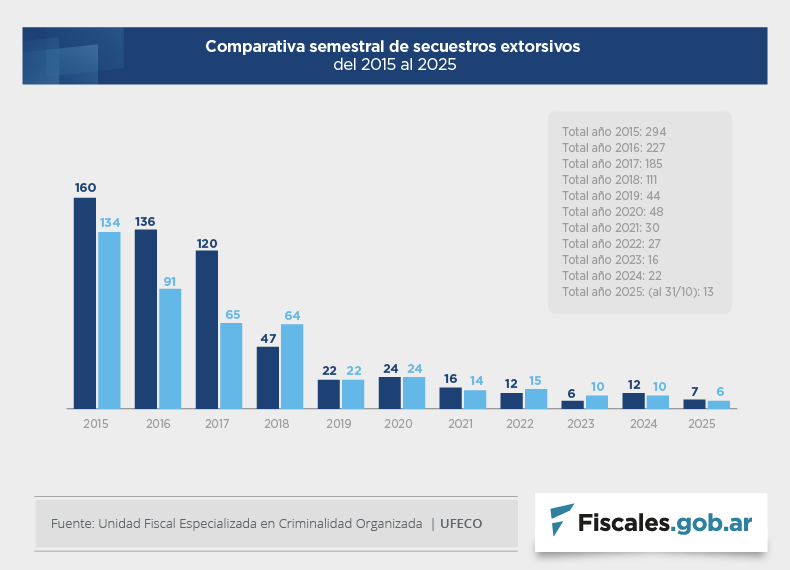 Un reporte estadístico de la unidad fiscal especializada indica que en lo que va de 2025 solo hubo 13 secuestros, lo que da un promedio de 1,3 hechos por mes, el registro más bajo de los últimos 10 años. Junio fue el otro mes del año en el que no hubo ningún caso en el país.