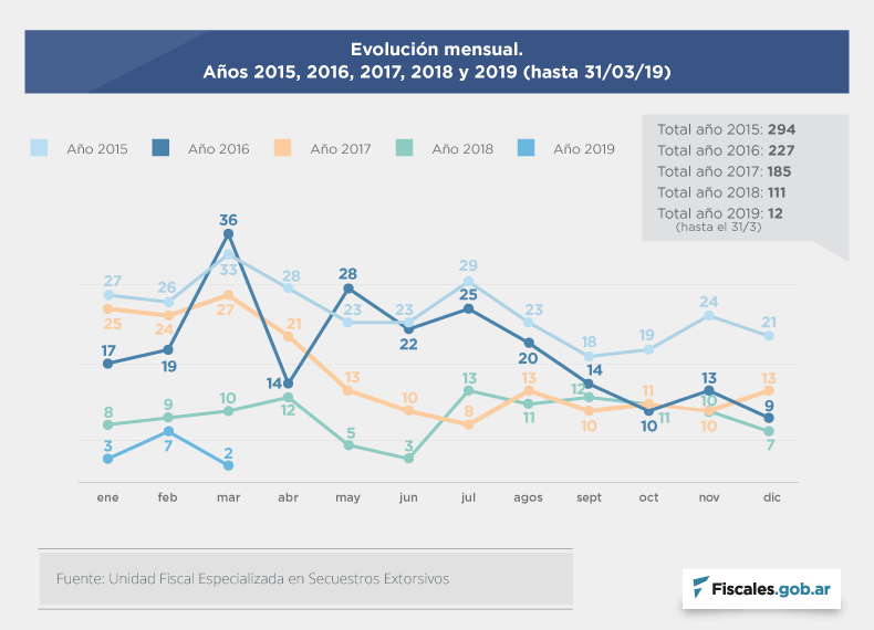 La Unidad Fiscal Especializada en Secuestros Extorsivos (UFESE), a cargo del fiscal federal Santiago Marquevich, presentó su informe mensual estadístico correspondiente a marzo de este año, del que se desprende que se registraron dos secuestros extorsivos durante ese periodo en todo el país. La cifra relevada es la más baja desde la creación de esa dependencia del Ministerio Público Fiscal, e implica un descenso en comparación a febrero de 2019, mes en que se detectaron siete hechos.