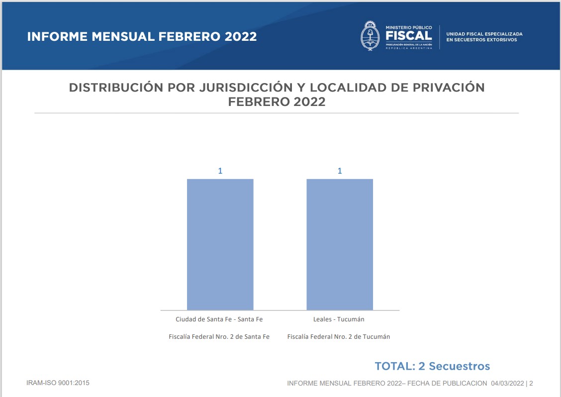 La Unidad Fiscal Especializada en Secuestros Extorsivos (UFESE), a cargo del fiscal federal Santiago Marquevich, presentó su informe correspondiente a febrero de 2022, del que se desprende que se registraron dos secuestros extorsivos durante ese mes en todo el país -en el que haya intervenido una fiscalía federal-, lo cual implica una disminución en relación con enero pasado, cuando se denunciaron tres hechos.
