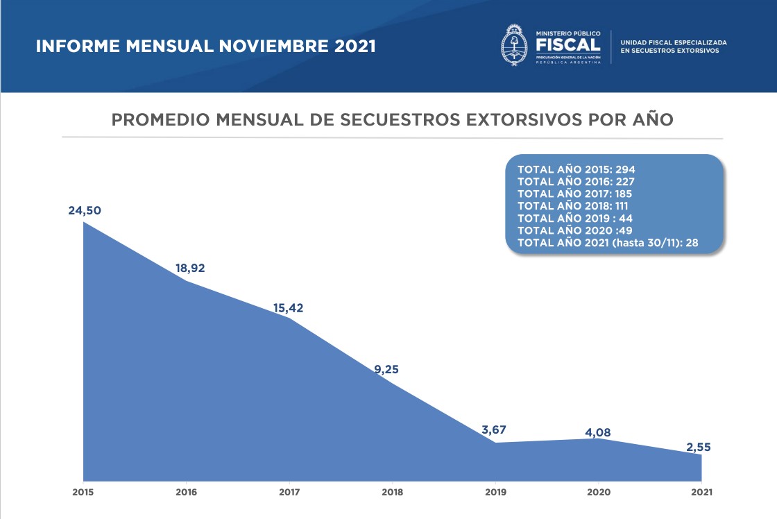 El relevamiento de los datos, desde 2015 hasta el 30 de noviembre de 2021, señala una tendencia a la disminución de este tipo de hechos. Así, en 2015 existieron 294 secuestros extorsivos; en 2016, 227; en 2017, 185 casos; en 2018, 111 hechos; en 2019, 44 casos; en 2020, sólo 49 secuestros; y, en lo que va del 2021, 28. Ello evidencia que la cifra de hechos denunciados disminuyó de 4,08 a 2,55 casos mensuales.