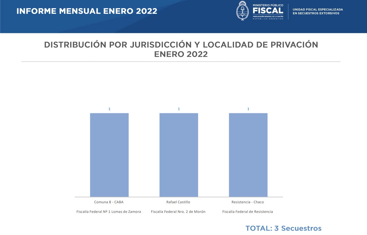 El informe consigna que los tres secuestros extorsivos tuvieron lugar en las provincias de Buenos Aires y Chaco. En el primero de los casos la víctima fue secuestrada en el ámbito de la Comuna N°8 de la Ciudad de Buenos Aires, pero su familia denunció lo ocurrido ante la Fiscalía Federal N°1 de Lomas de Zamora. Los dos restantes casos ocurrieron en la localidad bonaerense de Rafael Castillo, con intervención de la Fiscalía Federal N°2 de Morón, mientras que la Fiscalía Federal de Resistencia investiga un secuestro ocurrido en dicha jurisdicción.