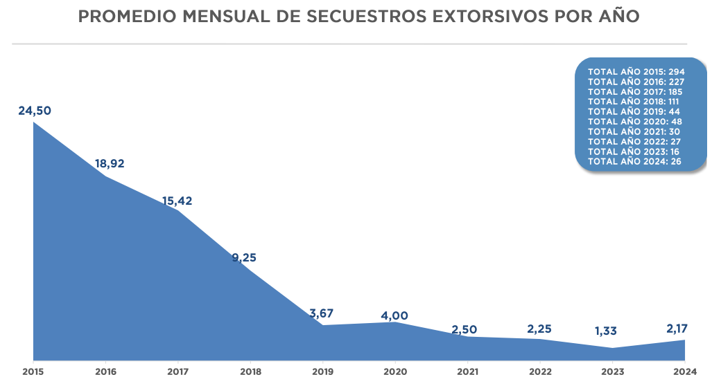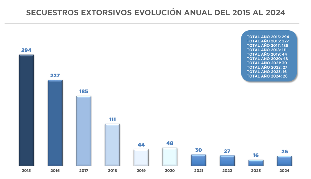 Así, en 2015 existieron 294 secuestros extorsivos; en 2016, 227; en 2017 existieron 185 casos; en 2018, 111 hechos; en 2019, 44 casos; en 2020, sólo 48 secuestros; en 2021, 30 hechos; en 2022, 27 secuestros; en 2023, 16 hechos y en 2024 se registraron sólo 26 casos.