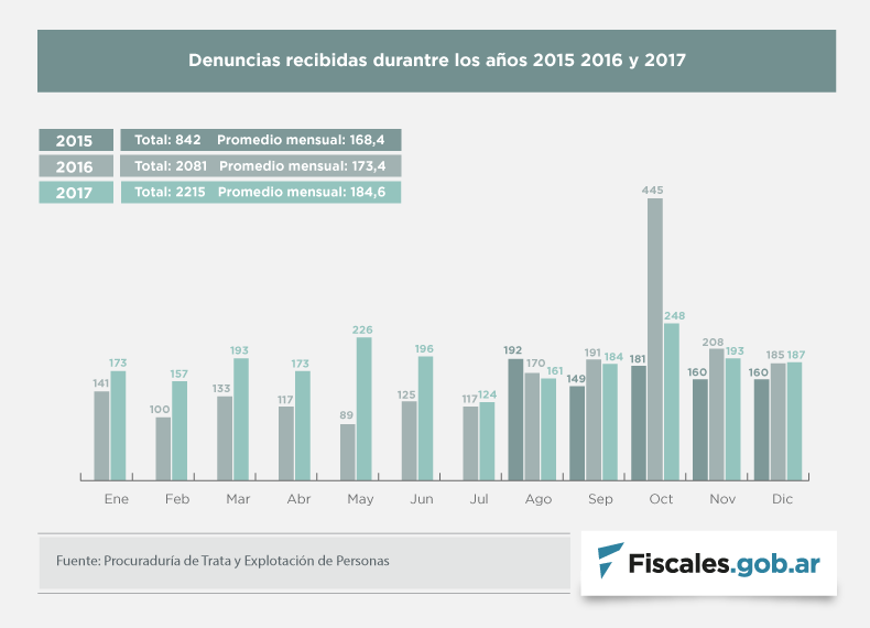 En ese sentido, destacaron que el 2017 fue el año que más denuncias recibieron en la línea 145, el centro de llamadas que co-administran junto al Programa Nacional de Rescate y Acompañamiento de Victimas Damnificadas por el Delito de Trata del Ministerio de Justicia y Derechos Humanos de la Nación. En ese sentido, la procuraduría especializada puntualizó que las denuncias de trata sexual son las más habituales, seguidas, por una amplia diferencia, por la de búsqueda de personas y luego muy cerca de las de explotación laboral.
