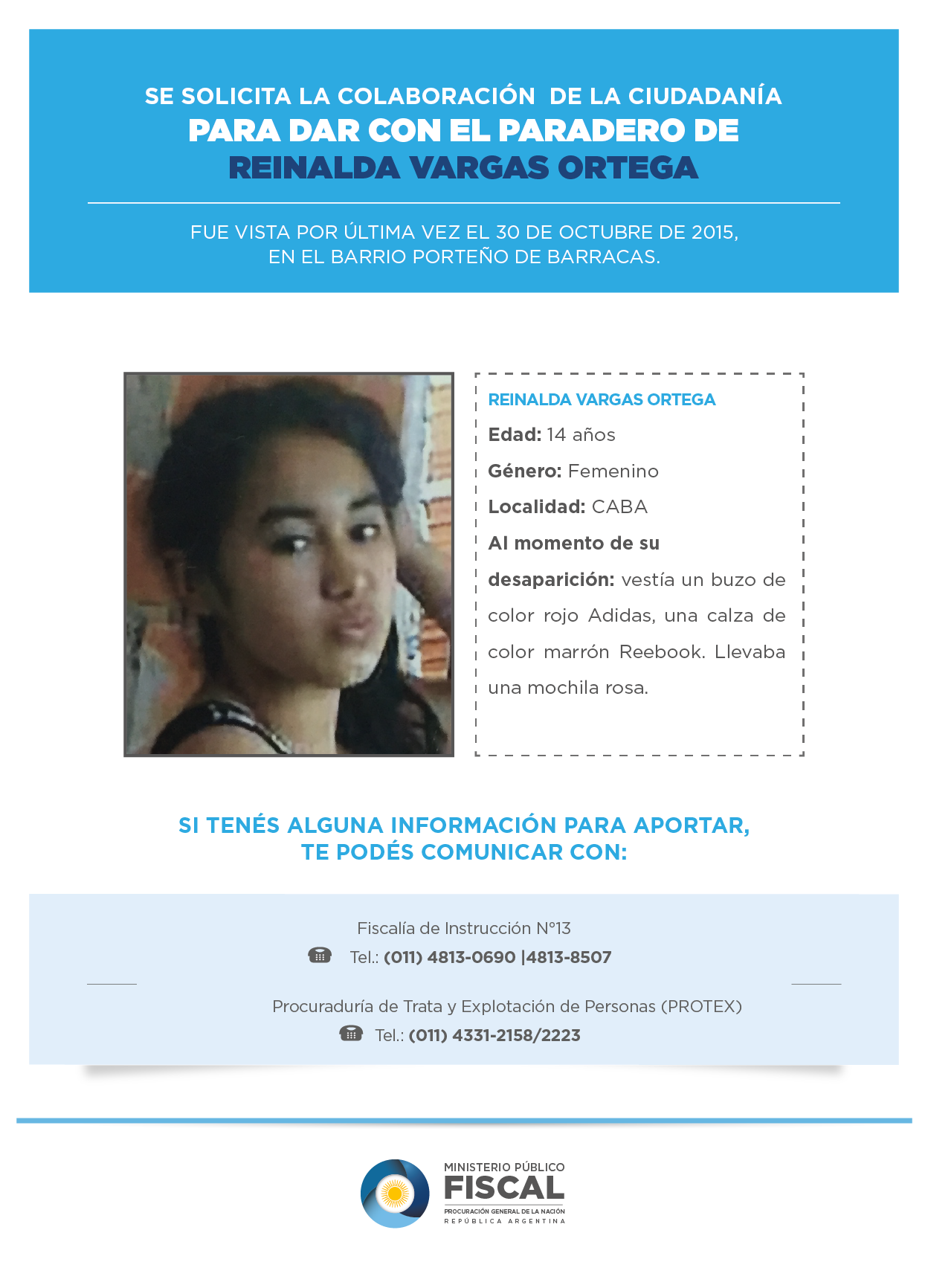 La Fiscalía de Instrucción N°13, a cargo de Marcelo Roma, y la Procuraduría de Trata y Explotación de Personas (Protex) solicitan la colaboración de la ciudadanía para dar con el paradero de Reinalda Vargas Ortega, de 14 años, quien fue vista por última vez el pasado 30 de octubre en el barrio porteño de Barracas.