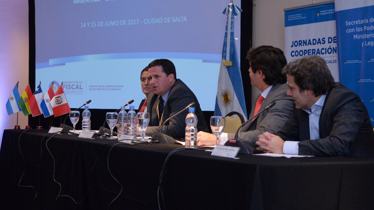 Los fiscales Eduardo Villalba, Santiago Marquevich, Diego Iglesias, Diego García Yomha y Alejandra Mángano expusieron ayer en los paneles "La importancia del sistema acusatorio en la lucha contra el crimen organizado", "Secuestro extorsivo y crimen organizado", "Narcocriminalidad", Análisis criminal y crimen organizado" y "La trata de personas para explotación sexual o laboral", de la III Jornada de Cooperación Internacional entre el Ministerio de Seguridad y el Ministerio Público que se lleva a cabo en la ciudad de Salta. En la actividad además participan funcionarios de los poderes Ejecutivo y Judicial, y magistrados de Bolivia, Paraguay, Chile y Perú. También, se realizó una reunión con los fiscales especializados en trata y narcocriminalidad de esos países.
