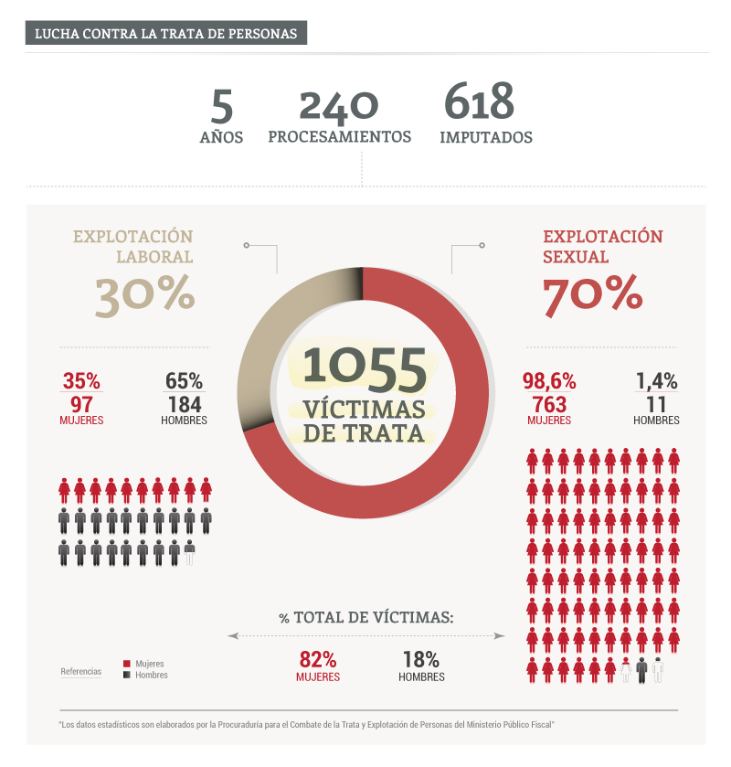 La lucha contra la trata tiene dos frentes bien definidos y con características propias, el de la explotación laboral y el de la explotación sexual. En los últimos cinco años se dictaron 240 procesamientos por el delito de trata, que involucran a 618 imputados y a 1055 víctimas.