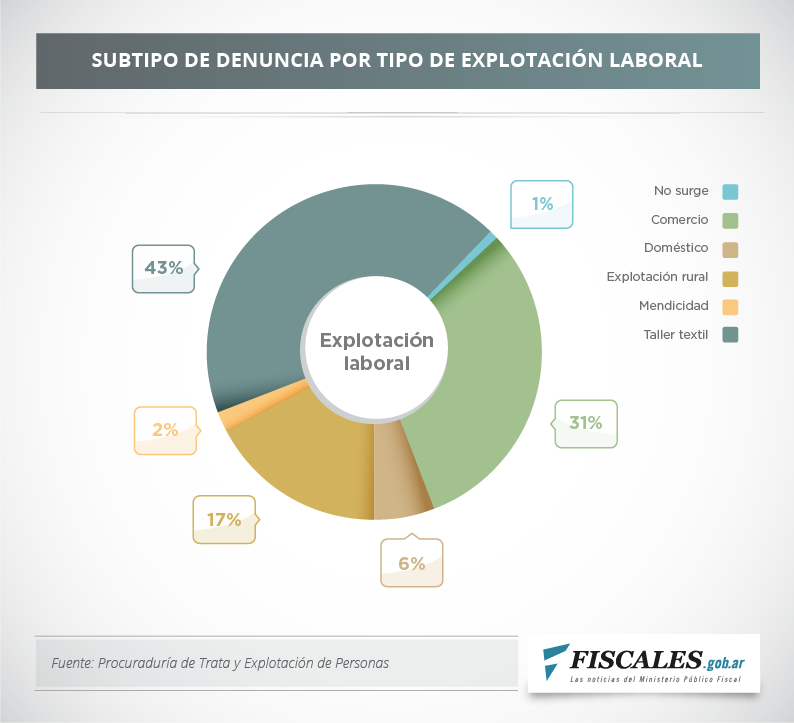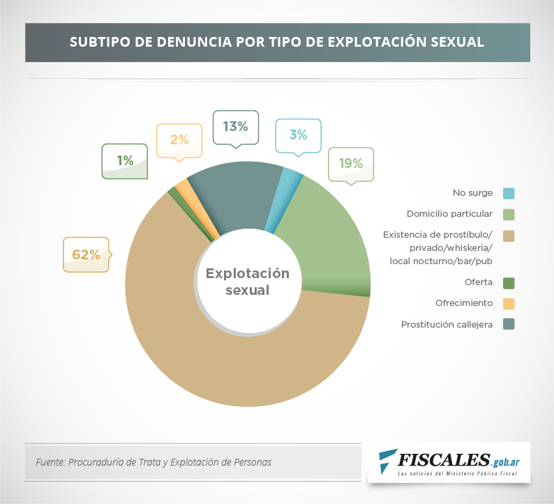 El documento detalló que el 62% de los llamados por posibles situaciones de explotación sexual refirieron la existencia de “prostíbulos”, “privados”, “whiskerías”, “locales nocturnos”, “bares” y/o “pubs”. En segundo lugar, se ubican los “domicilios particulares”, con el 19% de las comunicaciones, seguido por el 13% sobre “prostitución callejera”. En cuanto a explotación laboral, el 43% de los casos denunciados en ese centro de atención telefónica del Ministerio de Justicia hicieron referencia a la existencia de talleres textiles. Luego, con el 31%, se ubican establecimientos comerciales y con, el 17%, los establecimientos rurales.