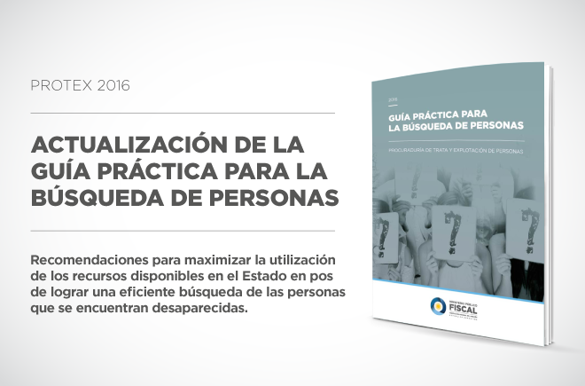 La primera edición de la “Guía práctica para la búsqueda de personas” elaborada por la Procuraduría de Trata y Explotación de Personas (Protex) fue publicada en el 2014 con el objetivo de poner en manos de las y los fiscales, funcionarias y funcionarios y del resto de los operadores jurídicos del Ministerio Público Fiscal una serie de herramientas de orientación frente a una denuncia por la desaparición de persona/s y, a la vez, una guía de recursos disponibles para facilitar su localización.