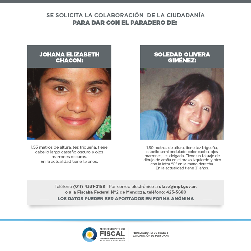 La Procuraduría de Trata y Explotación de Personas (Protex), a cargo de Marcelo Colombo, colabora con la Fiscalía Federal N°2 de Mendoza en la búsqueda de Soledad Olivera y Johana Chacón, desaparecidas en noviembre de 2011 y septiembre de 2012 en la ciudad de Lavalle.