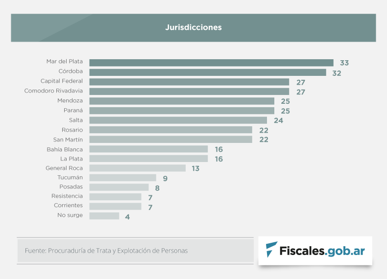 Respecto a las jurisdicciones involucradas en cada caso, Mar del Plata se encuentra primera en el listado, con 33 sentencias, seguida por la ciudad de Córdoba, con 32 y Capital Federal y Comodoro Rivadavia, ambas con 27 casos cada una. Las cifras son similares para Mendoza y Paraná (25), Salta (24), Rosario y San Martín (22). Bahía Blanca y La Plata registran 16 sentencias cada una, mientras que en la localidad rionegrina de General Roca fueron 13. Las cifras descienden en Tucumán (9), Posadas (8) Resistencia y Corrientes (7 sentencias).