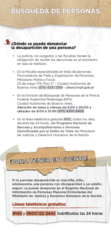 - División de Búsqueda de Personas de la Policía Federal: dirección: Madariaga 6976. Teléfono: (011)4370-5903.