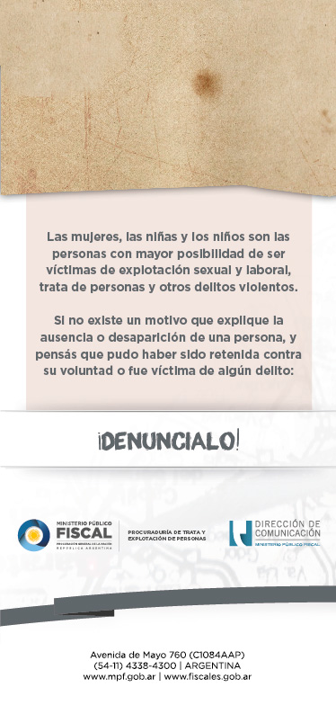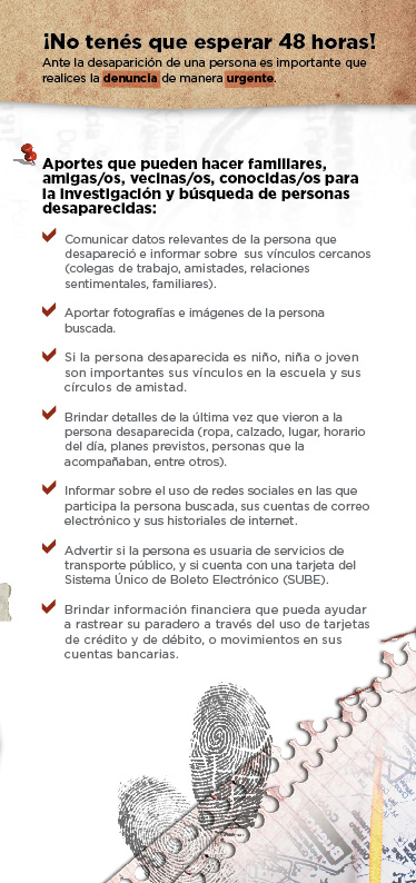 “¡No tenés que esperar 48 horas!”. El tono de alerta de las recomendaciones para la búsqueda de personas elaboradas por la Procuraduría de Trata y Explotación de Personas (Protex) es clave para iniciar un proceso de respuestas institucionales de agentes de fuerzas de seguridad y operadores judiciales. Es que ante una desaparición, es importante realizar la denuncia de manera urgente: las acciones que se realizan en las primeras horas son fundamentales en la investigación.