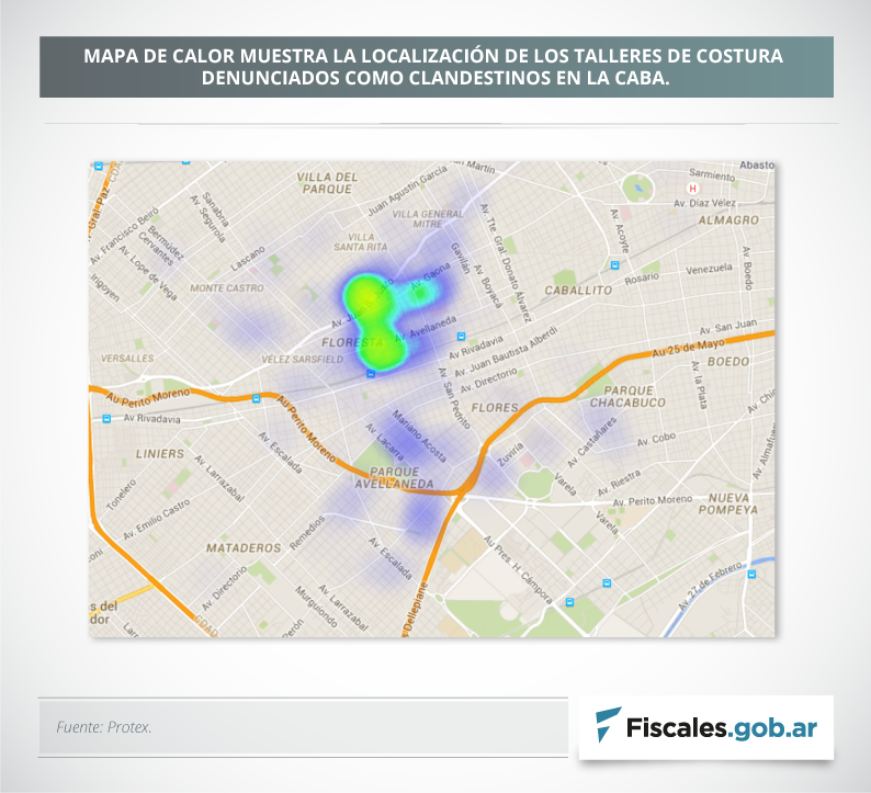 El área de mayor densidad de este tipo de locales -que habitualmente están compuestos "por cinco o diez empleados no registrados"- se encuentra en el barrio de Floresta, entre las avenidas Rivadavia, Nazca, Juan B. Justo y Segurola. "Además, una alta concentración de domicilios se ubica en la zona comercial conocida como 'Avellaneda', donde se nuclean cientos de comercios de venta mayorista y minorista de indumentaria y de productos de diferentes rubros -calzado, juguetería, bazar, entre otros- que son ofrecidos en la vía pública", detalló la Protex.