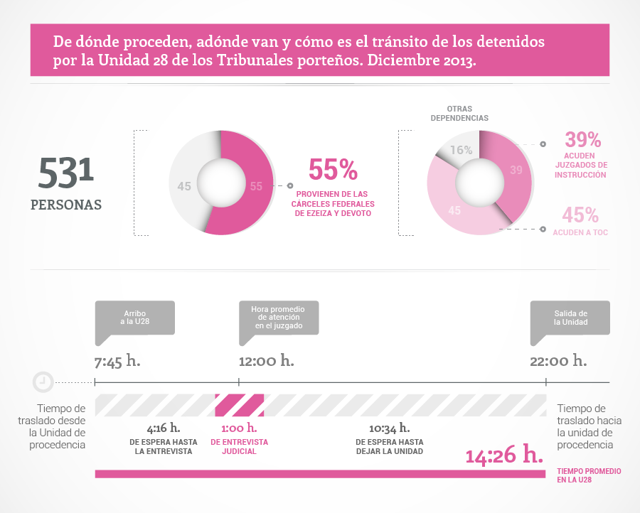 El estudio está basado en los casos de 531 personas que transitaron durante diciembre por la Alcaidía de Tribunales, de las cuales el 94 por ciento fueron hombres. Un 55 por ciento de quienes recayeron en la U28 provenían de las cárceles federales I, de Ezeiza, y II, de Marcos Paz, distantes a 40 y 68 kilómetros, respectivamente, del centro de detención judicial. Para la Procuvin, ese dato es trascendente, pues "a los tiempos de permanencia en la Unidad se deben sumar los tiempos de viaje".