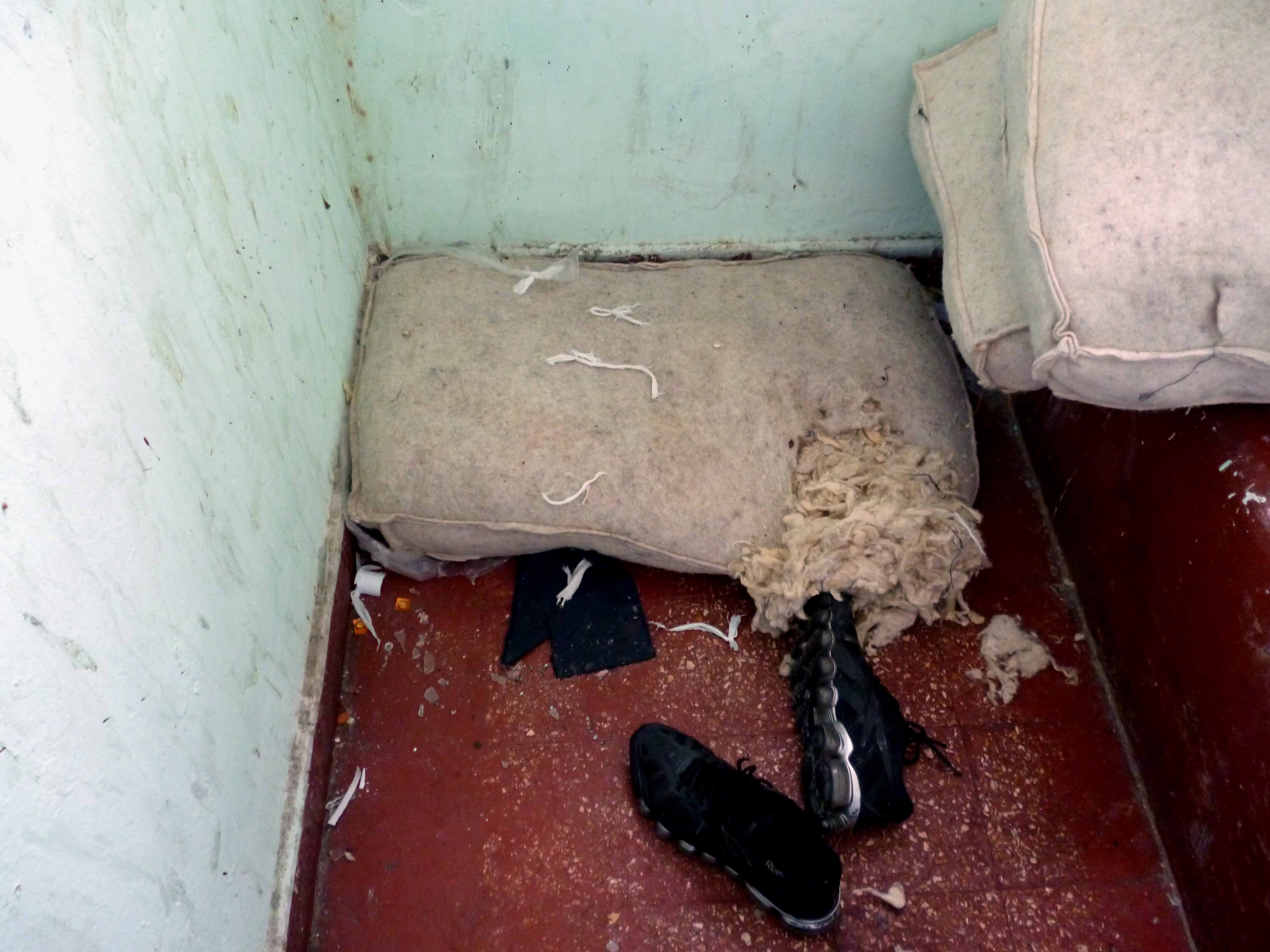Durante la noche anterior no le suministraron la cena, y tampoco le llevaron comida en el transcurso de la mañana. Como no le permitieron ducharse, tenía las huellas de los golpes y el fuego en su cuerpo. Lo único que llevaba consigo era la ropa que vestía. La celda estaba vacía, a excepción de pedazos de colchones rotos: le negaron las mantas y la ropa de cama (foto). Tenía marcas en la cabeza, varias escoriaciones y moretones en la espalda, tórax, piernas y un corte en unos de sus brazos.