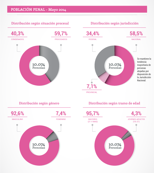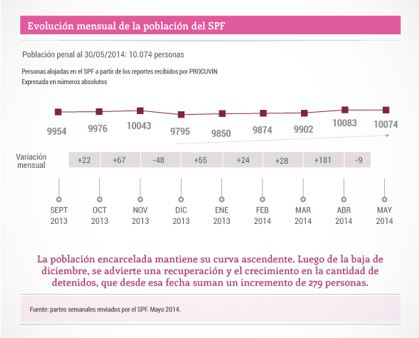 El informe revela que al 30 de mayo las 10.074 personas en dependencias del SPF han variado con un leve descenso de nueve personas respecto de abril, pero contabilizando 120 más que en septiembre de 2013, cuando la Procuvin comenzó a recibir la información del SPF. Ahora bien, desde diciembre -cuando hubo una baja considerable- y hasta a fin de mayo se registró un incremento en la población penal de 279 personas.