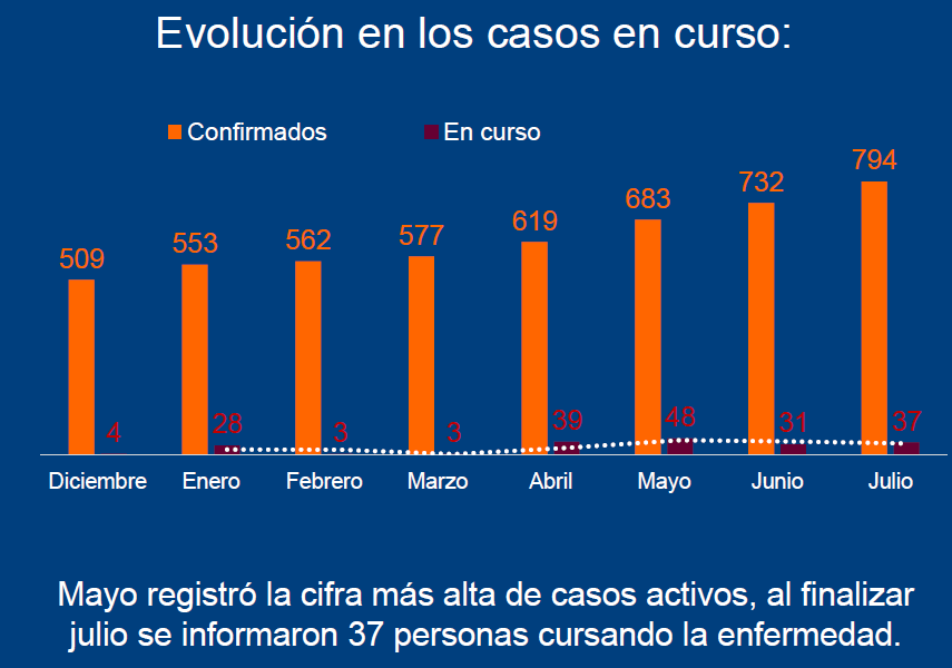 El documento señala que a julio de 2021 los establecimientos del (SPF) reportaron 794 personas con diagnóstico confirmado desde el inicio de la pandemia. Solo en 2021 fueron registrados 285 casos, de los cuales 62 se registraron en julio. El registro de ese mes fue la cifra más alta luego de los detectados en mayo (64). A su vez, el crecimiento más importante de contagios tuvo lugar en los establecimientos de Marcos Paz y en la Unidad 34 de Campo de Mayo. El reporte indicó también que el Complejo II de Marcos Paz concentra el mayor nivel de contagios, pasando de 66 a 113 casos durante el bimestre, lo que expresó un salto del 71% respecto de los casos reportados en mayo.