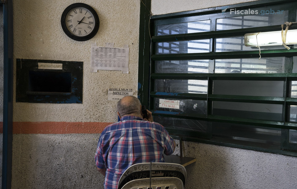 Una persona mayor habla por teléfono desde la cárcel federal de Marcos Paz. Foto de archivo: C. Conteris/Fiscales.gob.ar