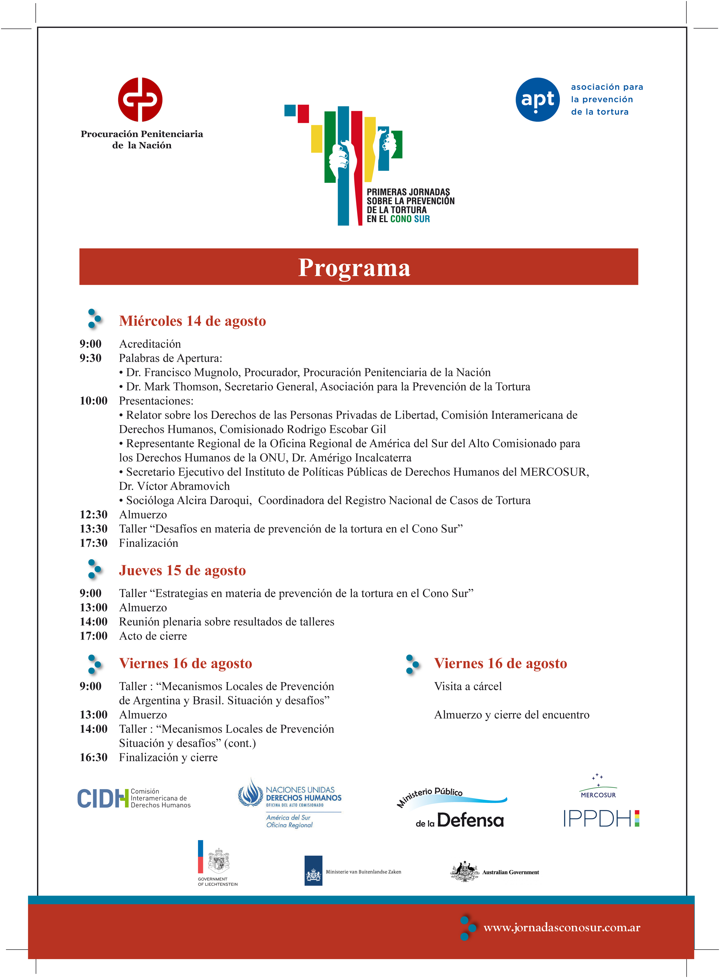 Luego habrá presentaciones del relator sobre los Derechos de las Personas Privadas de Libertad de la Comisión Interamericana de Derechos Humanos, Rodrigo Escobar Gil, del representante de la Oficina Regional de América del Sur del Alto Comisionado para los DDHH de la ONU, Amérigo Incalcaterra, del secretario ejecutivo del Instituto de Políticas Públicas de DDHH del Mercosur, Víctor Abramovich, y de la coordinadora del Registro Nacional de Casos de Tortura, Alcira Daroqui.