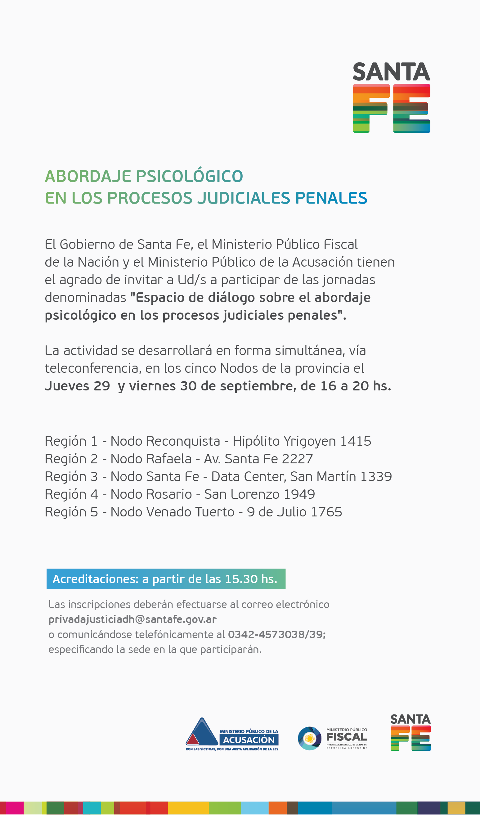 Para informes e inscripción, los interesados podrán contactarse vía correo electrónico a privadajusiticadh@santafe.gov.ar o telefónicamente al (0342) 457-3038 ó (0342) 457-3039.