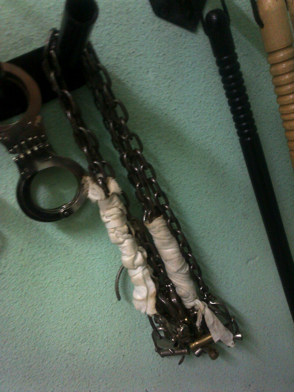Por otro lado, en el sector donde se equipan los guardias encargados de la requisas, los funcionarios hallaron cuatro cadenas para atar a las personas, junto a los bastones y las esposas que utilizan regularmente los penitenciarios en los procedimientos. Las cadenas tenían vendas en sus extremos. Las autoridades del penal explicaron que no se utilizaban, pero la apariencia y el estado de las condiciones de acceso a ellas convencieron a los funcionarios de lo contrario y procedieron a su secuestro, tal como ocurrió hace dos años en un penal de Córdoba.